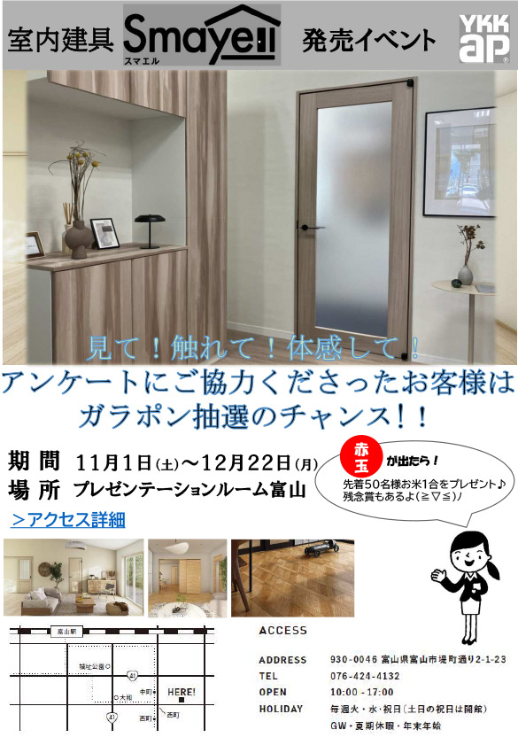 ※上記のお電話ではプレゼンテーションルーム富山に関するお問い合せとご予約を承っております。カタログの請求や商品に関するお問い合せについては、下記よりお問い合せください