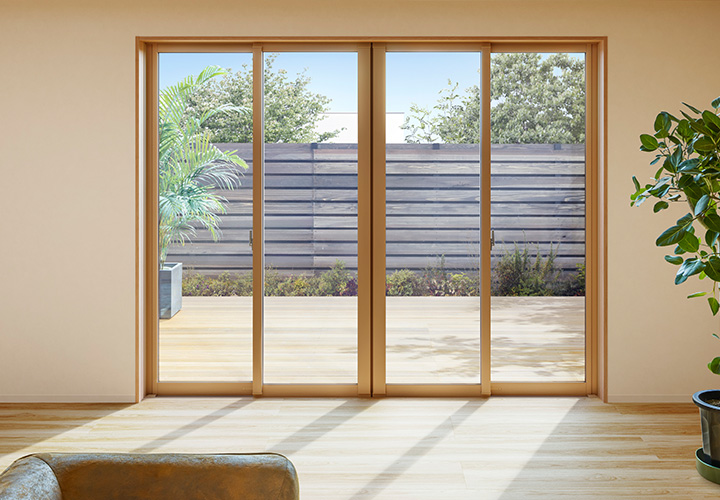 国産桧を使用した、温かみのある木の窓。住まいと自然に調和し空間に安らぎを与える、高断熱の大開口窓です。