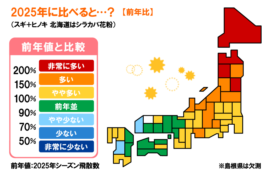 飛散量が多い翌年は雄花の形成が抑えられるため、2026年春の花粉飛散量は前シーズンと比べ、西日本では広い範囲で減少するでしょう。東日本と北日本は前シーズンより多く、非常に多い所もある見込みです。