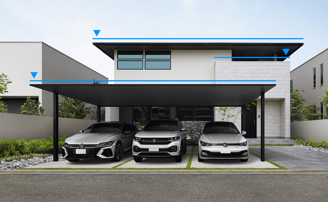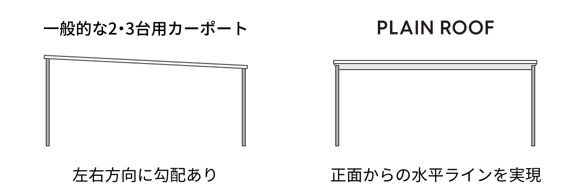 一般的な2・3台用カーポートは、雨水処理のため左右方向に屋根勾配を設けているため、正面から見た際の傾き感が、建物の水平ラインとの不調和を生むことがありました。