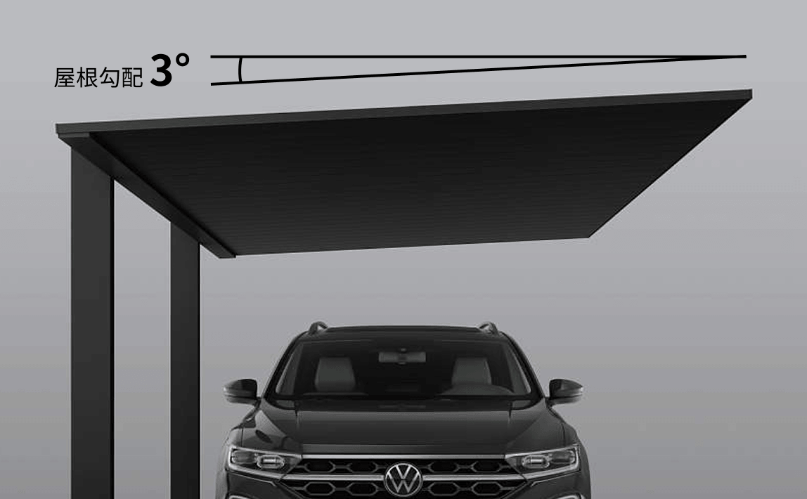 正面からの勾配を限りなく抑え、同カテゴリーのカーポートとしては最も水平に近い「3°」を実現。