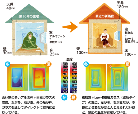 築30年の住宅と最近の新築住宅を比べると、壁や天井、床に充填する断熱材の厚さが部位により3〜4倍に、窓のガラスは単板からLow-E複層になり、家は格段に暖かく、快適になった。平成28年の基準変更では、窓の断熱性能が枠を含めて測られることになった(以前はガラスのみ)。