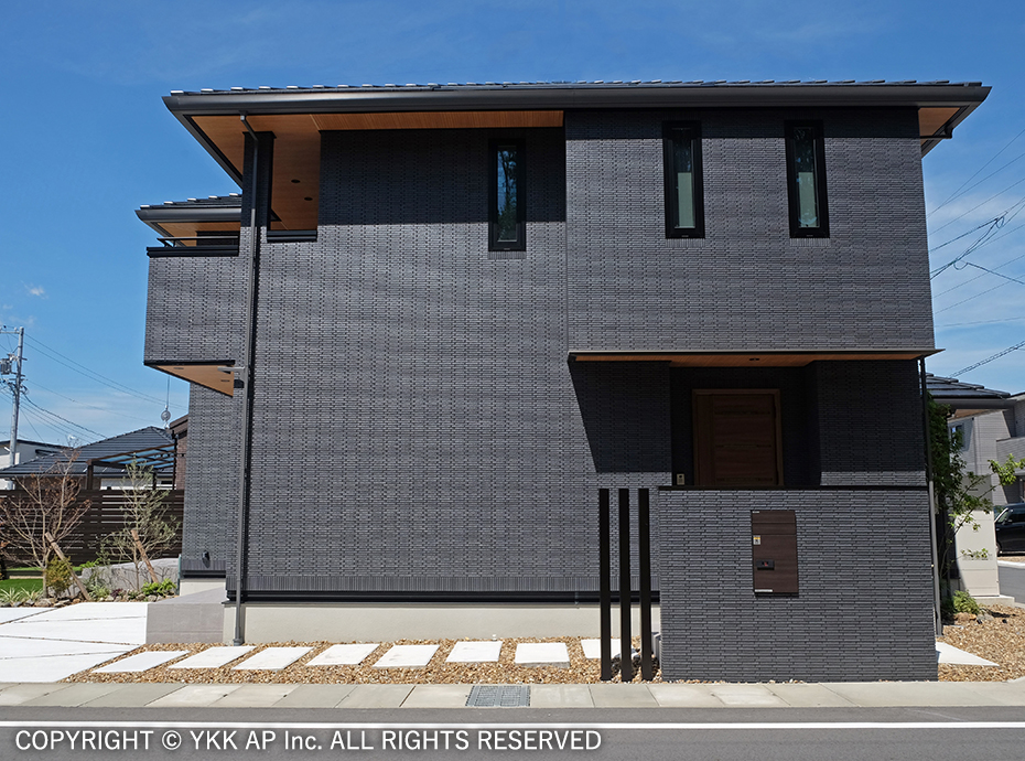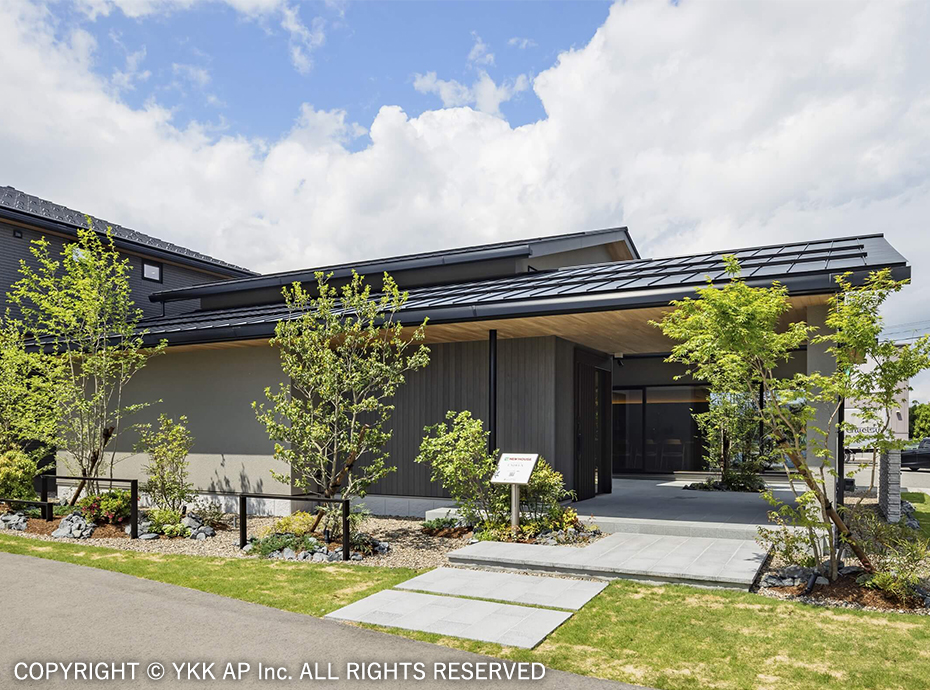 様々な樹木と植栽が建物と美しく調和し、自然の美しさを演出。花ブロックとルシアス フェンスLiteを組み合わせることで、モダンなカッコよさをプラス。花ブロックの素材感が、植栽の緑と対比しながら、建物全体に独特な存在感を、ルシアス フェンスLiteは、シンプルでありながらもスタイリッシュなアクセントとなり、全体のバランスを引き締めました。さらに、大小の石と樹木をうまく配置することで、自然な風景を再現し、訪れる人々に四季折々の美しさを提供してくれる展示場に仕上がりました。