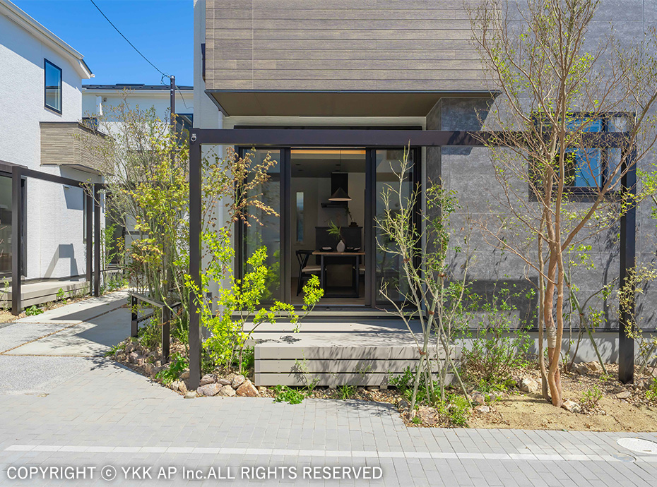 協定道路を囲むような4棟の分譲地です。すべてのお宅にリレーリア フレームを設置し、境界を緩やかに表現しました。また協定道路をシェアしながら生まれるコミュニティスペースを演出するためにリウッドデッキ 200を設置し、笑顔溢れる寛ぎの空間を作りました。アルミ商材で硬くなりがちな街並を、質感高い自然素材で設え、潤いのある植栽計画としました。