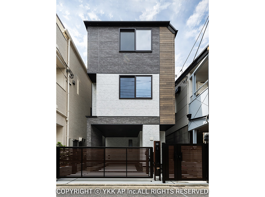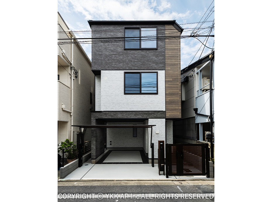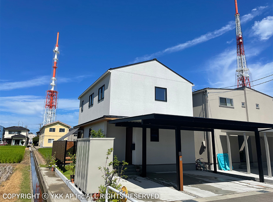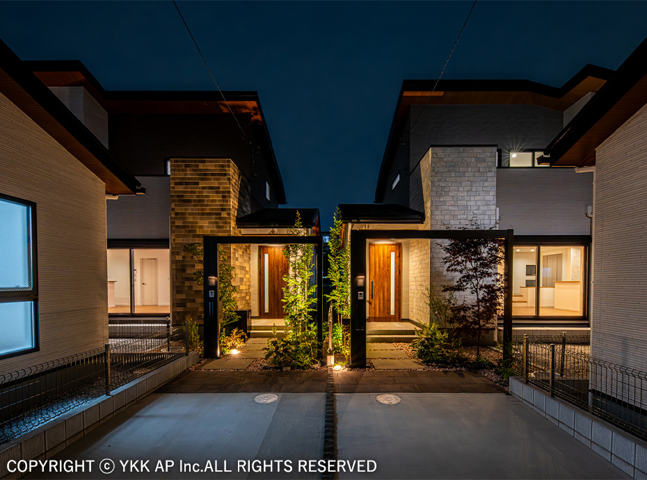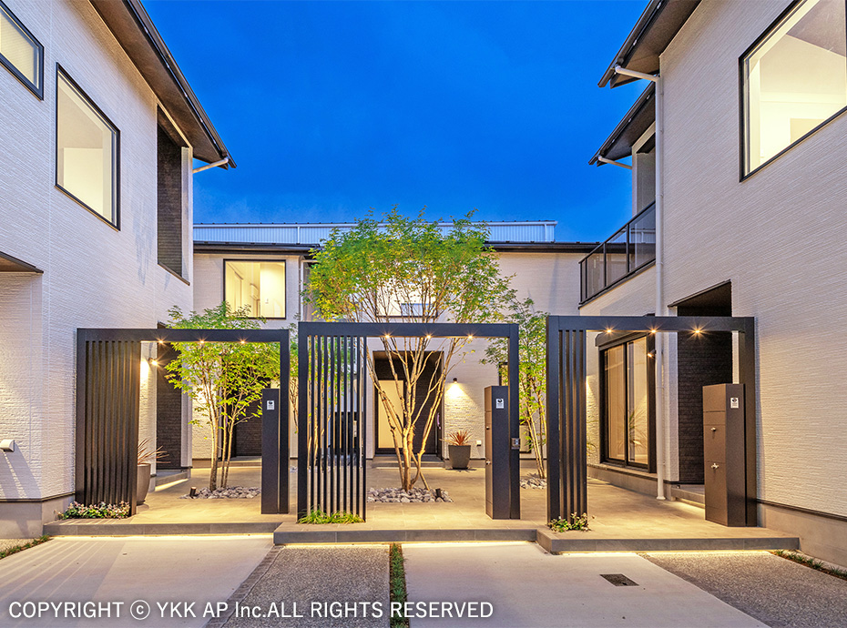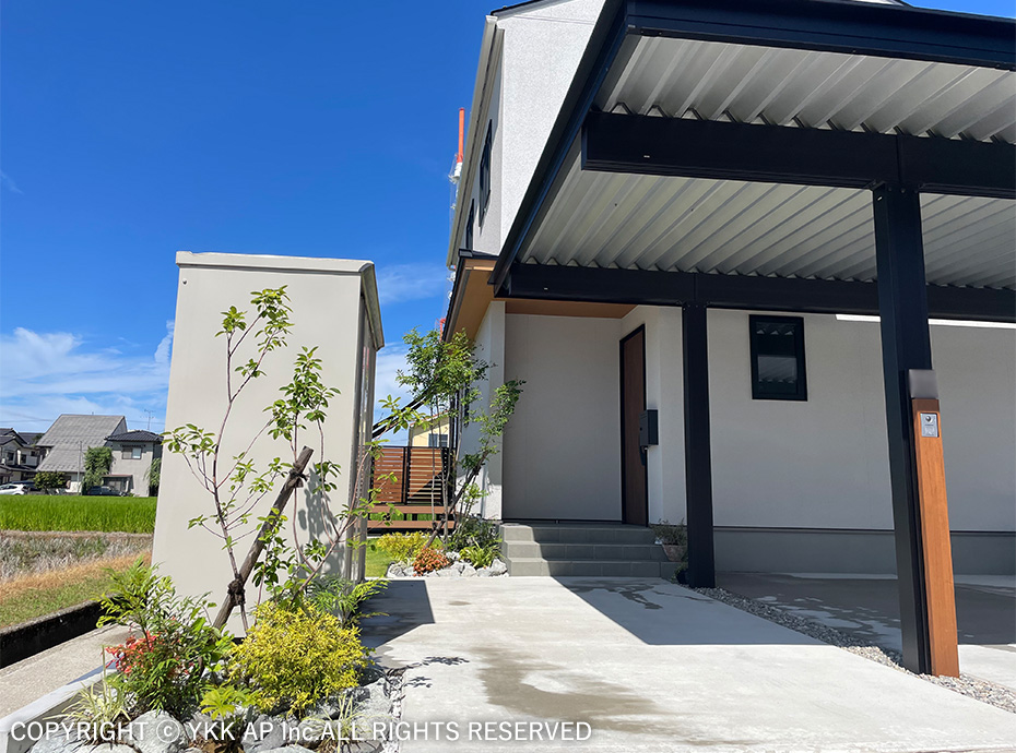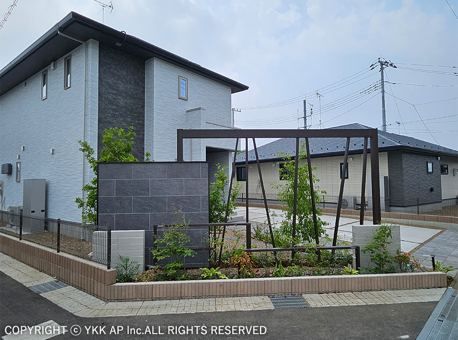 敷地は目の前にお店が立ち並ぶ通りに面しており、ゲートフレームを設置することで街並みを作りながらもプライバシーを確保することを目指しました。また、ゲートフレームと植栽を組み合わせることで商品のコンセプトでもある『つなぐ』をより柔らかに演出しました。植栽の足元にはプリュード パーティションフレームユニットを配し、フレームのシークエンスも意識しました。玄関前には防犯の意識や配送業2025年問題等の考えから、玄関ドアにも採用したピタットKey システム対応の宅配ボックスを設置しました。