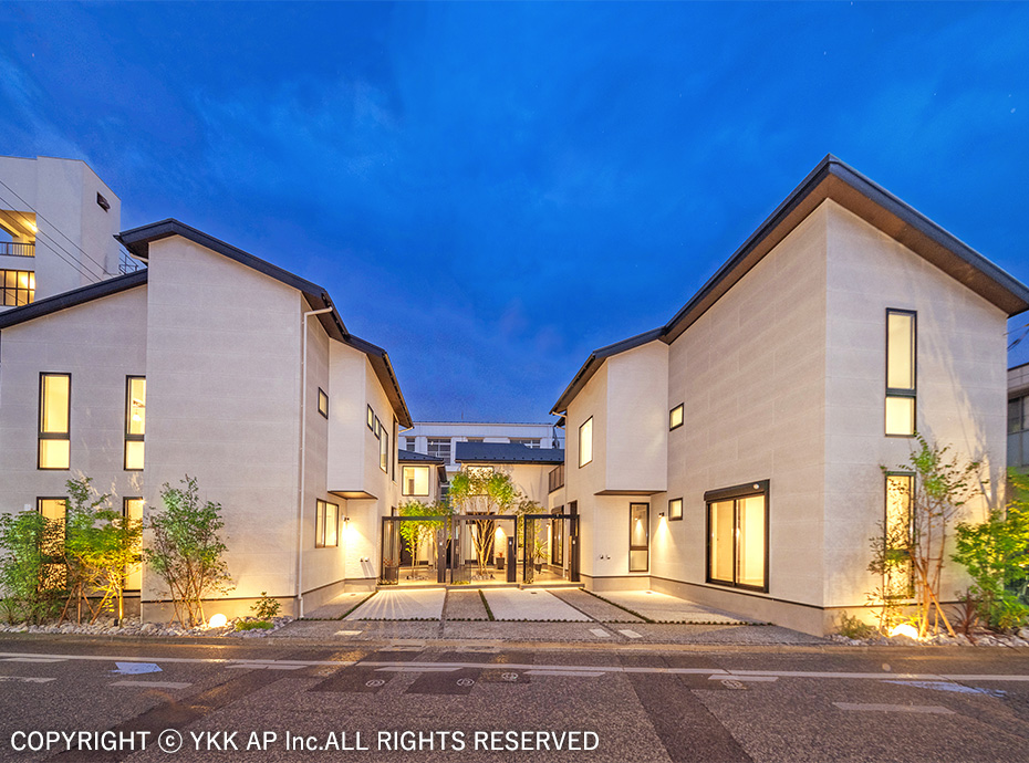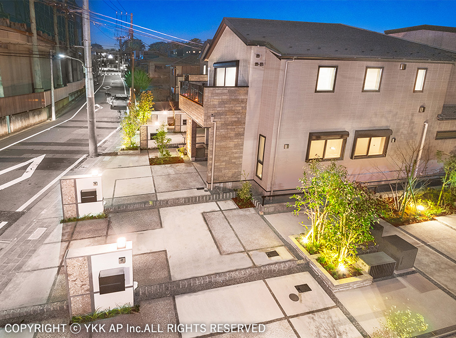 無機質になりがちなアスファルトを排して、インターロッキング素材で全面舗装された道路空間を囲んだ、コミュニティの形成を目指したまちづくりの提案となっています。まちなみ景観上道路との繋がりに対して重要なポイントとなる足元には、プリュードや景石、適度な緑化による巧みな修景により、空間的な連続性を確保することに成功しています。夜間の演出も、注意深く配置された壁面照射や軒下照明により、魅力的な夜景を演出しつつ、建物側から滲み出る室内光ともあいまって、街区全体としての防犯性能も高められた提案となっています。