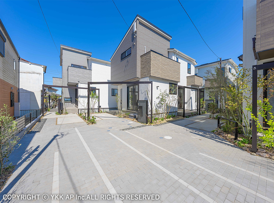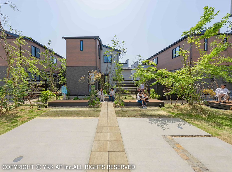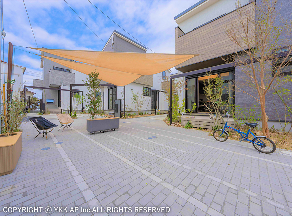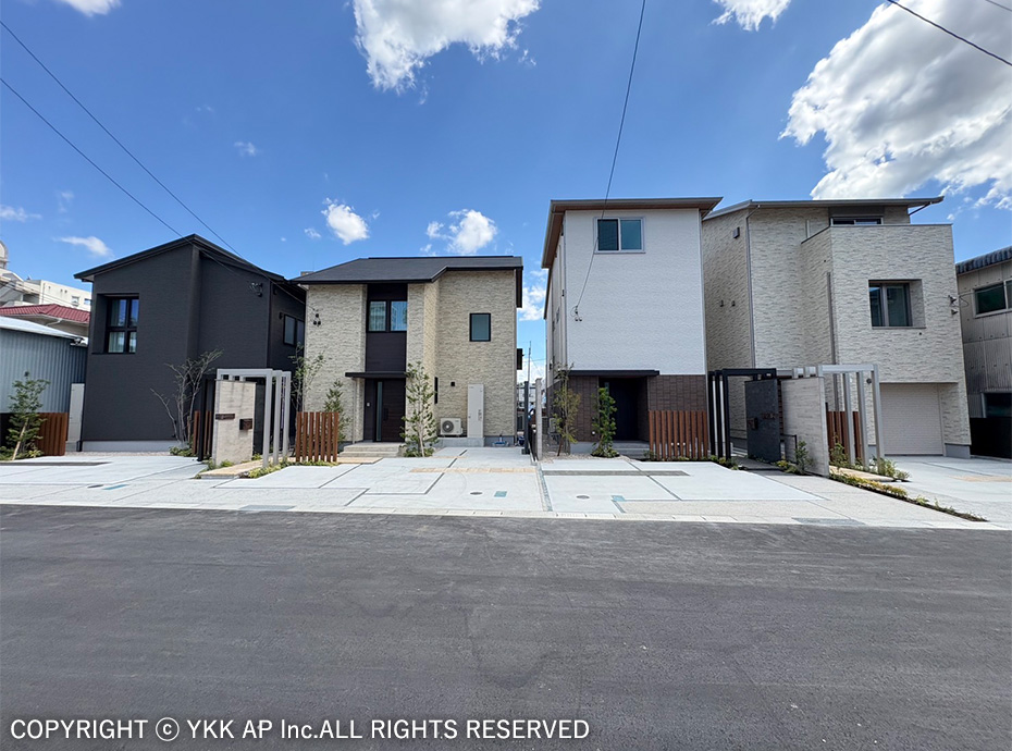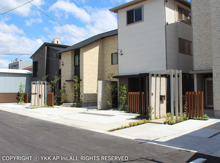 協定道路を囲むような4棟の分譲地です。すべてのお宅にリレーリア フレームを設置し、境界を緩やかに表現しました。また協定道路をシェアしながら生まれるコミュニティスペースを演出するためにリウッドデッキ 200を設置し、笑顔溢れる寛ぎの空間を作りました。アルミ商材で硬くなりがちな街並を、質感高い自然素材で設え、潤いのある植栽計画としました。