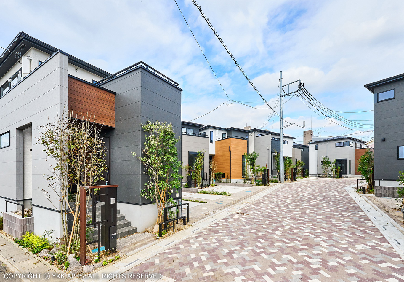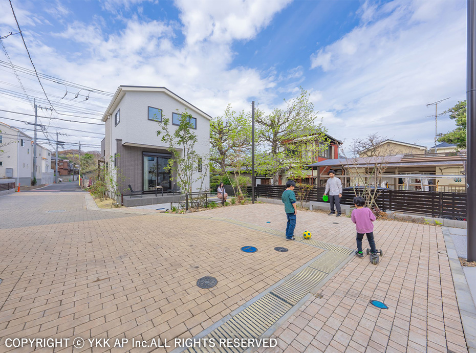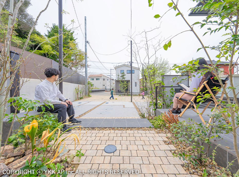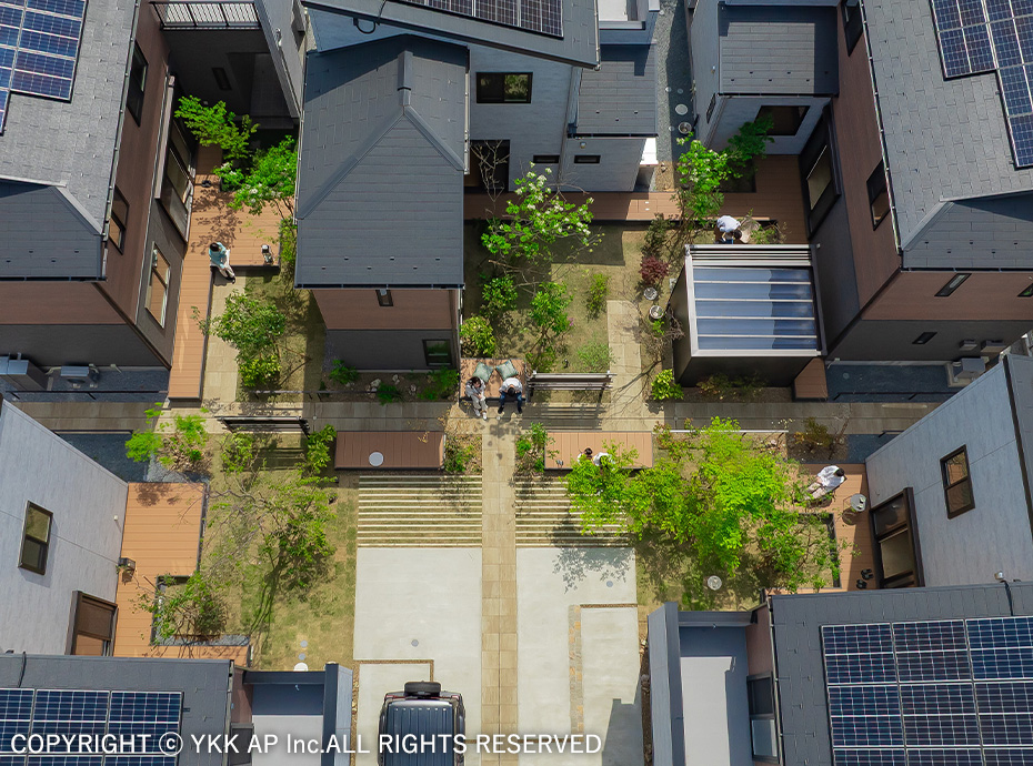 協定道路を囲むような4棟の分譲地です。すべてのお宅にリレーリア フレームを設置し、境界を緩やかに表現しました。また協定道路をシェアしながら生まれるコミュニティスペースを演出するためにリウッドデッキ 200を設置し、笑顔溢れる寛ぎの空間を作りました。アルミ商材で硬くなりがちな街並を、質感高い自然素材で設え、潤いのある植栽計画としました。