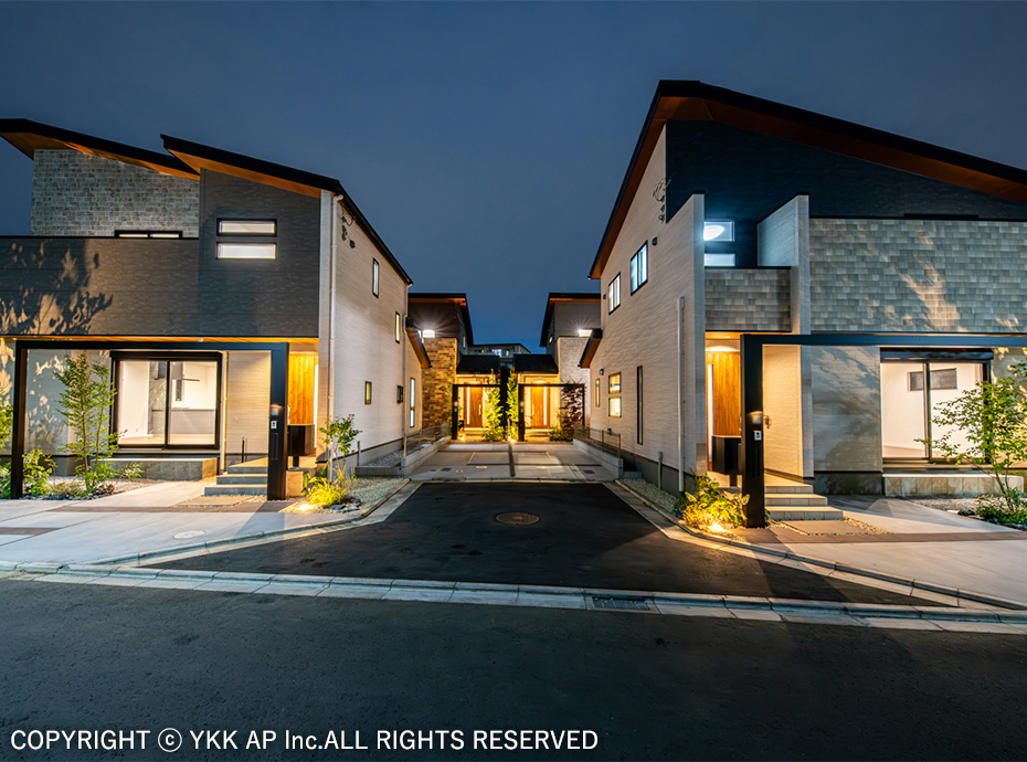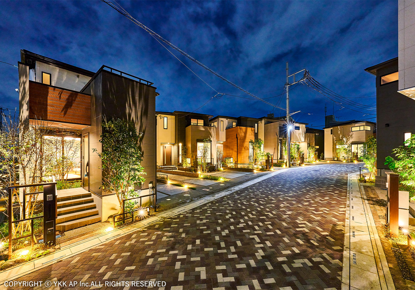 光・緑・陰が織りなす、唯一無二の邸宅空間・この分譲地は、南ひな壇の形状が全ての邸宅に明るい陽光をもたらし、開放的な住空間を実現しました。ワンエントランスの街区内にはクルドサックを配置し、住民が安心して交流できるコミュニティを育みます。エクステリアは上質さを追求し、美しい街並みはもちろん、室内から望む借景にも配慮。日が暮れると昼間の風景が夜の帳の中に新たなアートとして浮かび上がるようなドラマティックな演出を可能にしました。幻想的な表情を創り出し、洗練された五感で感じられる暮らしを提供します。