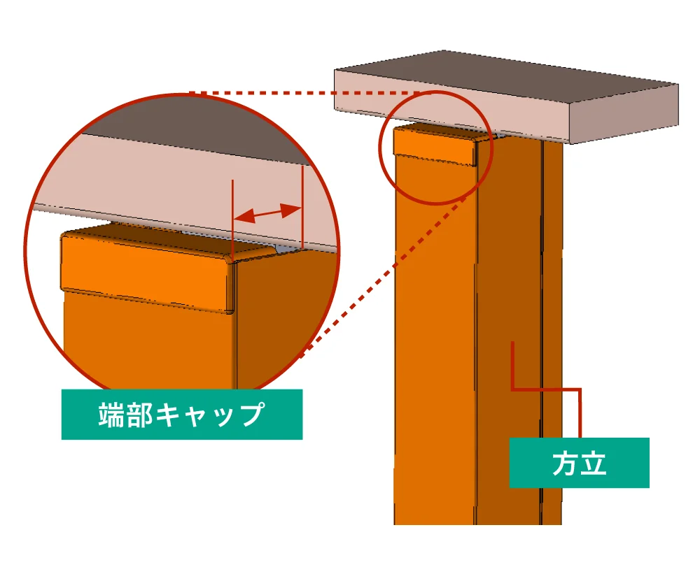 現行品の無目と同様に、方立も枠持出し納まりの際に小口が露出しない端部キャップを標準設定。