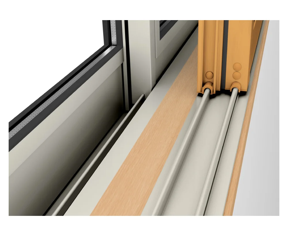 引違い窓同様、持出した枠のコーナー部の安全性に配慮し、コーナーキャップを標準装備。枠持出し納まりの際の障子の脱落防止に配慮し、コーナーキャップには持出し量の限度を示す位置決めラインを装備。