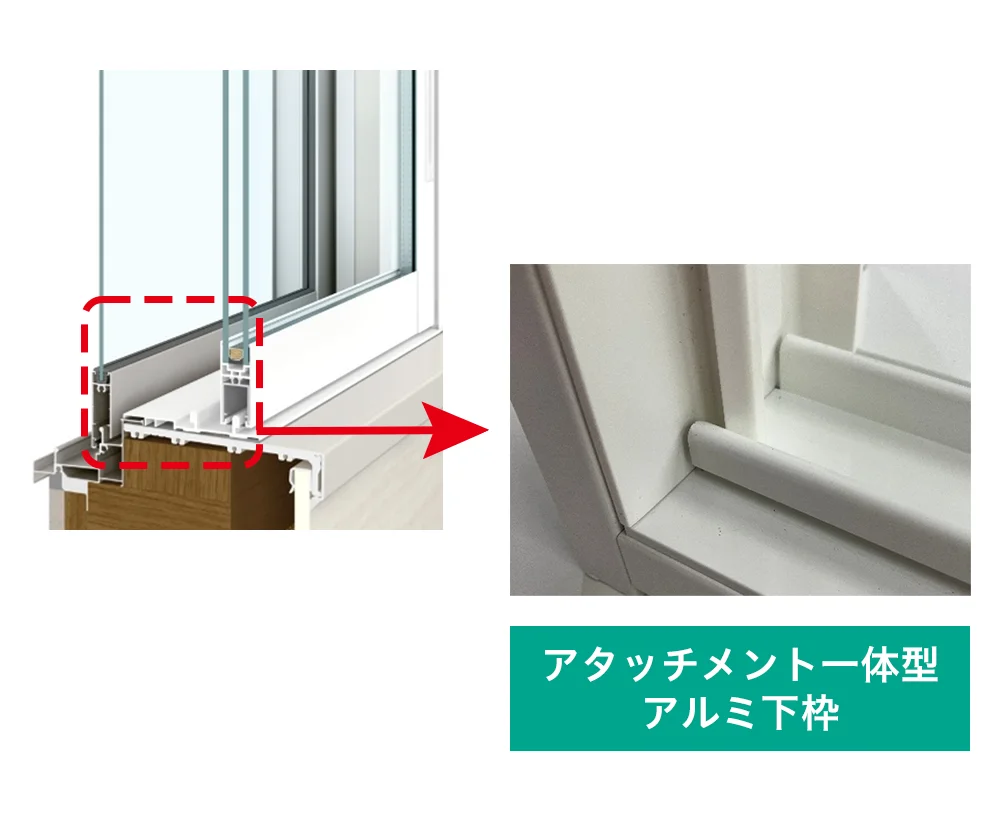 アタッチメント一体型のアルミ下枠を採用したことによって施工性が向上し、さらに強度の担保を実現。
