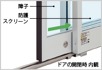 防護スクリーンは戸袋全面を覆うため、入居者が帰宅した際に、万が一、戸袋側に他の入居者が手をついている場合でも、ドアが開いた際の衝突を防ぎます。