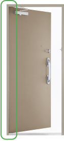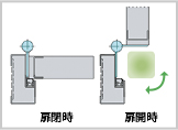 ドアの開閉時に吊元側の枠と障子の間にすき間が生じないので、つまずいて不意に吊元側に手をおいてしまった場合でも、指のはさまれを未然に防ぎます。